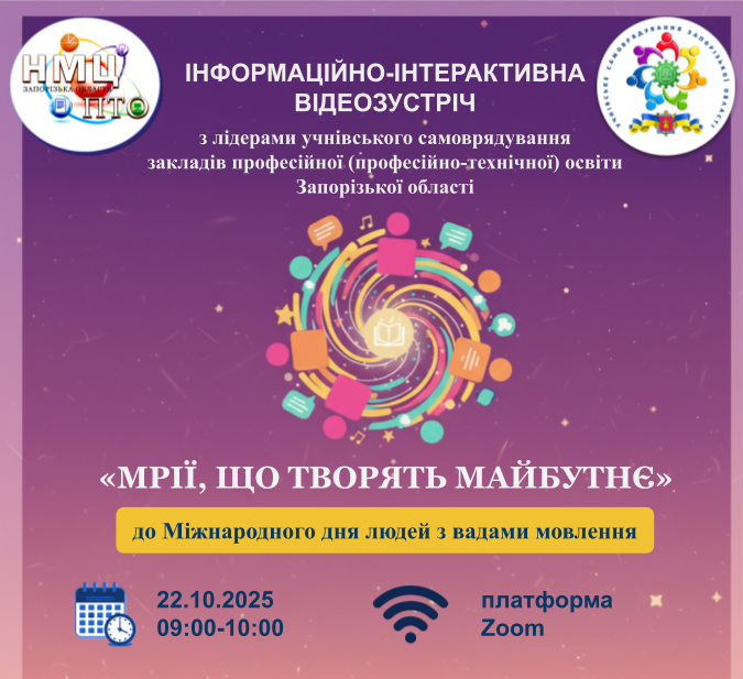 22 жовтня 2025 року успішно відбулася Інформаційно-інтерактивна відеозустріч із лідерами учнівського самоврядування закладів професійної (професійно-технічної) освіти Запорізької області. Захід, організований Науково-методичним центром професійно-технічної освіти (координатори – Дар’я ЛИННИК, Світлана ГРИТЧИНА, методисти центру), був присвячений Міжнародному дню людей з вадами мовлення