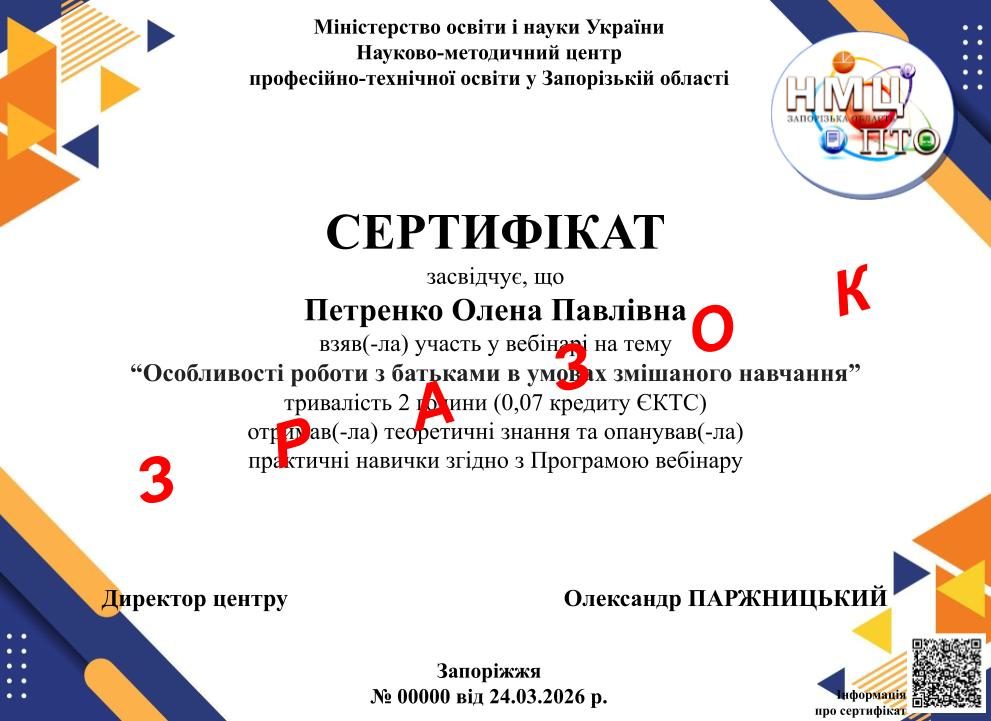 24 березня 2026 року Науково-методичним центром професійно-технічної освіти у Запорізькій області був проведений вебінар “Особливості роботи з батьками в умовах змішаного навчання”.