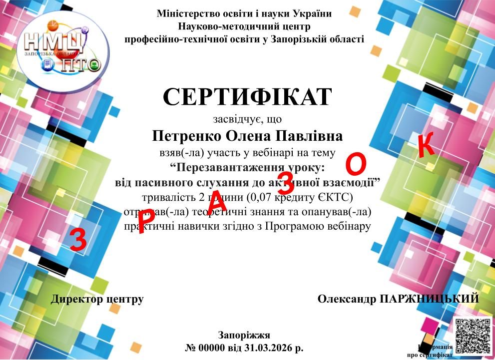 31 березня 2026 року Науково-методичним центром професійно-технічної освіти у Запорізькій області був проведений вебінар “Перезавантаження уроку: від пасивного слухання до активної взаємодії”.