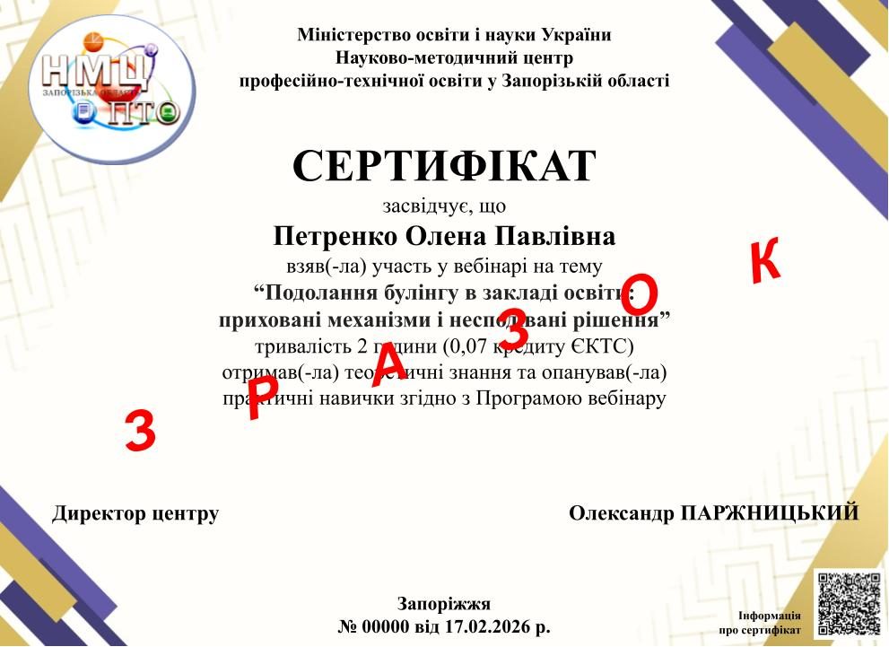 17 лютого 2026 року Науково-методичним центром професійно-технічної освіти у Запорізькій області був проведений вебінар “Подолання булінгу в закладі освіти: приховані механізми і несподівані рішення”.