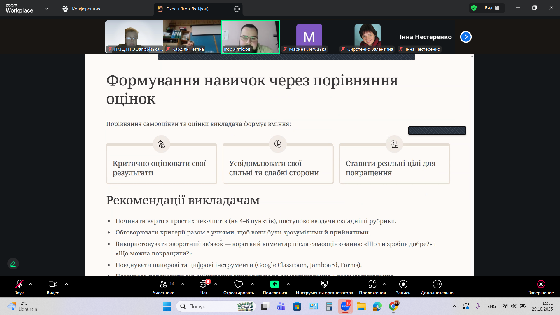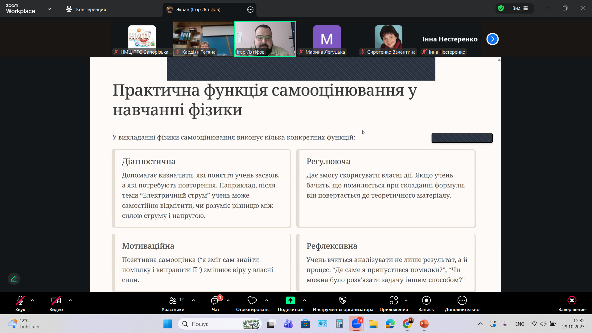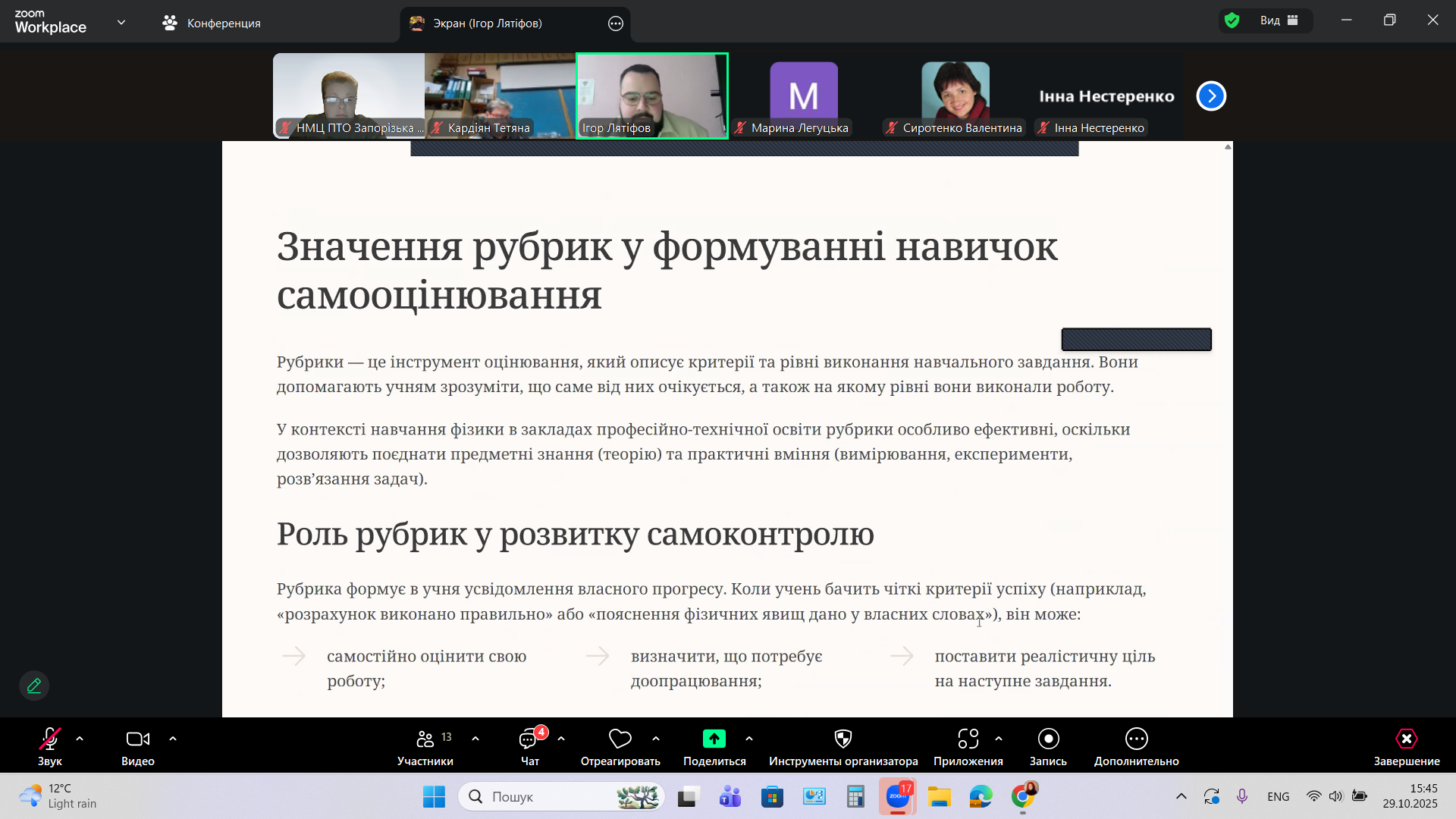 «Організація діяльності з корекції знань та вмінь учнів, щодо розвитку у них навичок самоконтролю та самооцінки» – під такою назвою 29 жовтня 2025 року, в дистанційній формі на платформі Zoom, Науково-методичним центром професійно-технічної освіти у Запорізькій області, було організовано та проведено методичний семінар-тренінг для викладачів фізики і астрономії закладів професійної (професійно-технічної) освіти Запорізької області.