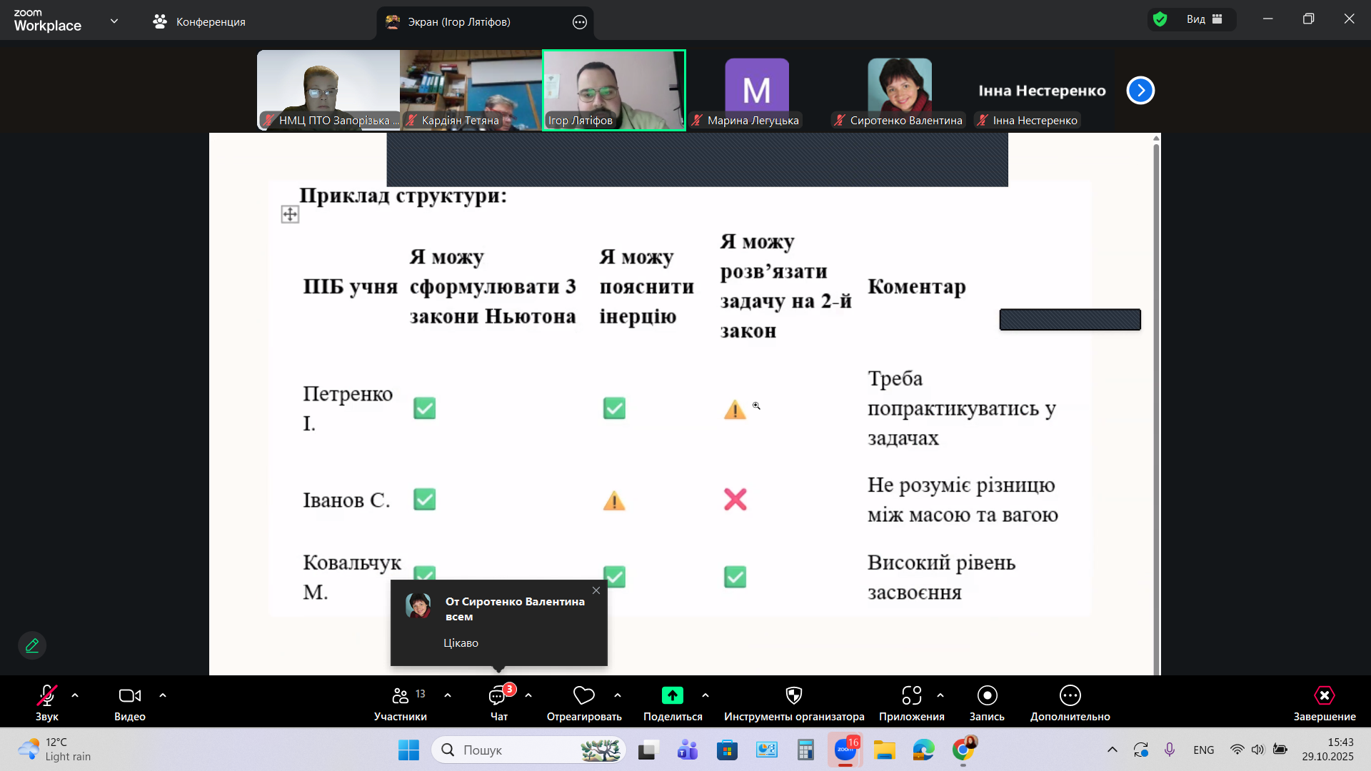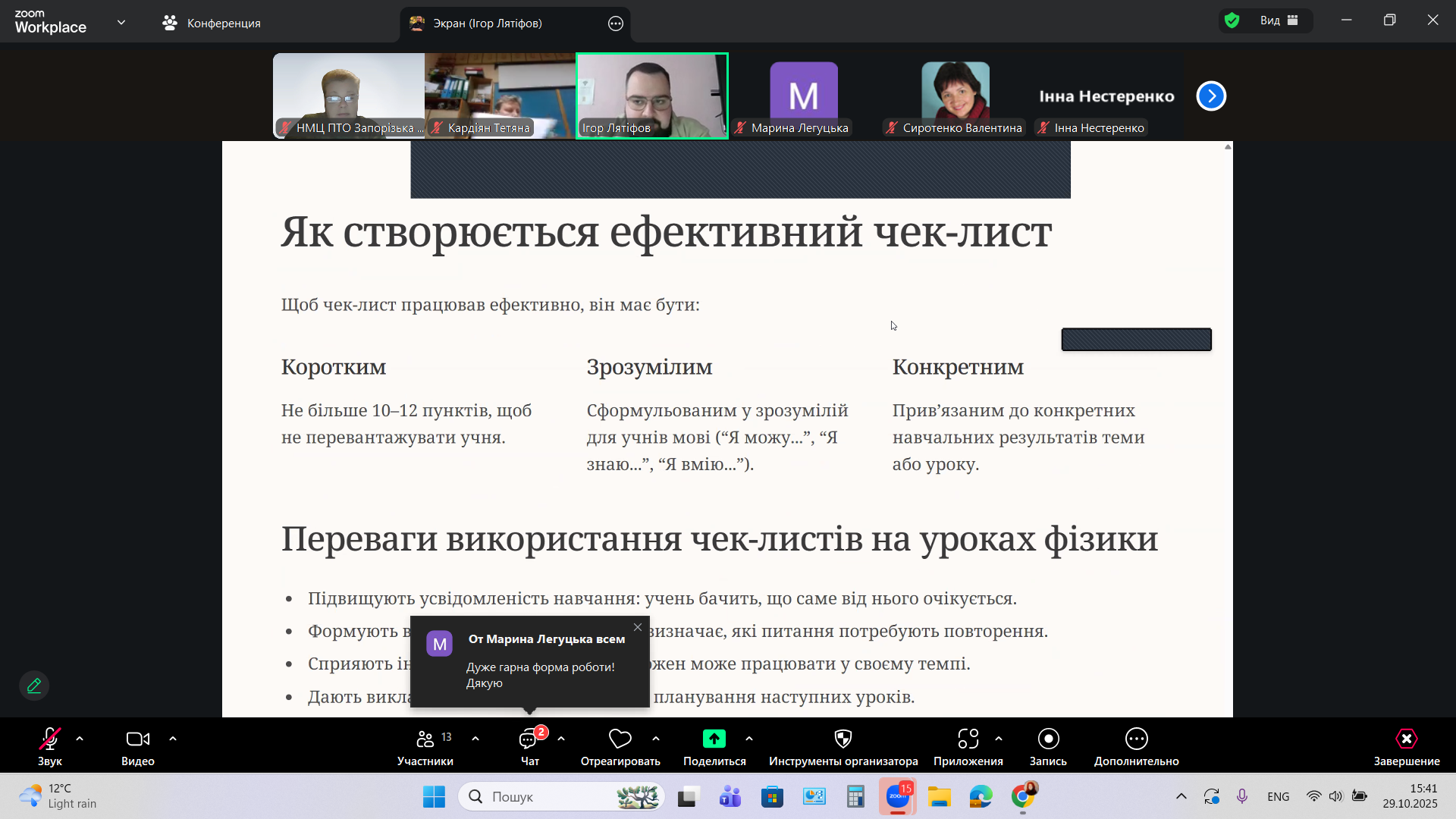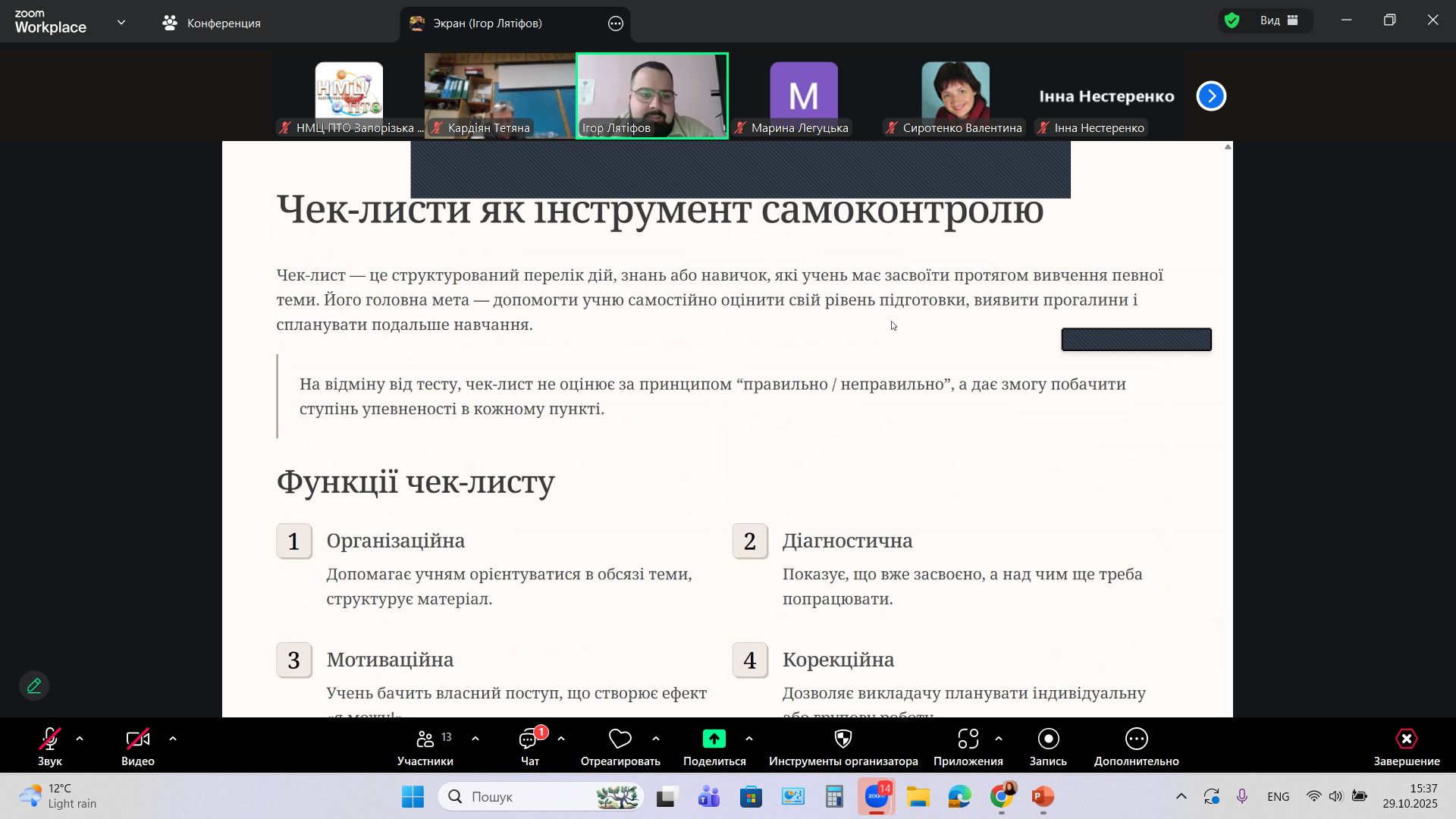 «Організація діяльності з корекції знань та вмінь учнів, щодо розвитку у них навичок самоконтролю та самооцінки» – під такою назвою 29 жовтня 2025 року, в дистанційній формі на платформі Zoom, Науково-методичним центром професійно-технічної освіти у Запорізькій області, було організовано та проведено методичний семінар-тренінг для викладачів фізики і астрономії закладів професійної (професійно-технічної) освіти Запорізької області.