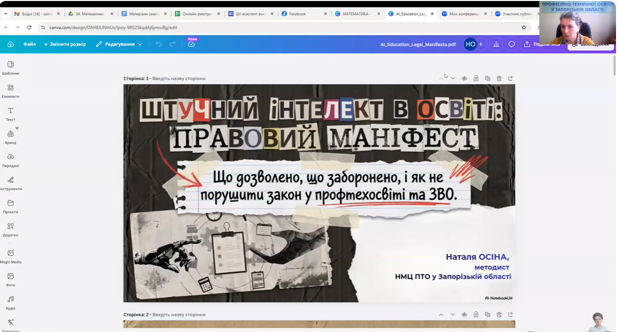 Наталя ОСІНА, методист центру закцентувала увагу на правові аспекти використання штучного інтелекту в освітньому процесі; особливу увагу звернула на авторське право, академічну доброчесність та захист персональних даних під час використання штучного інтелекту.