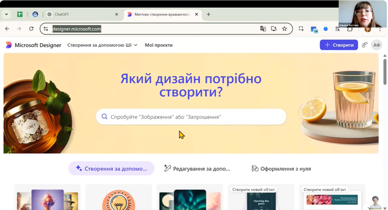 Альона ФАСТОВА, викладач математики та інформатики ДНЗ “Пологівський професійний ліцей” поділилася досвідом створення інфографіки на основі ШІ-технологій; розповіла про етапи створення інфографіки, продемонструвала корисні нейромережі та провела майстер-клас щодо створення інфографіки за допомогою сервісу Microsoft Designer.