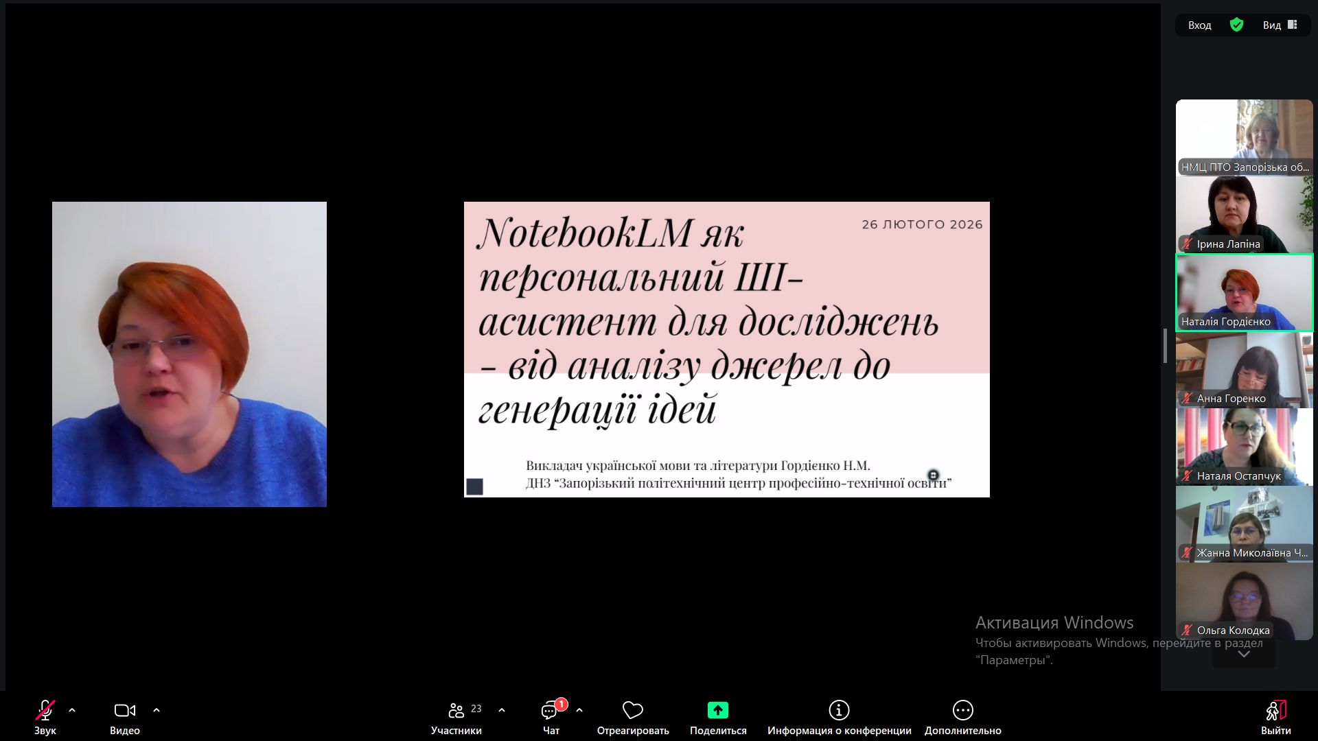 Наталія Гордієнко, викладач української мови та літератури ДНЗ «Запорізький політехнічний центр професійно-технічної освіти» виступила з доповіддю на тему «NotebookLM як персональний ШІ-асистент для досліджень – від аналізу джерел до генерації ідей». NotebookLM – це потужний інструмент на базі штучного інтелекту, що допомагає працювати з великими обсягами інформації. Цей сервіс спрощує дослідження, навчання та створення контенту, пропонуючи унікальні способи аналізу джерел. Спікерка зупинилась на можливостях та найкращих сценаріях застосування сервісу.