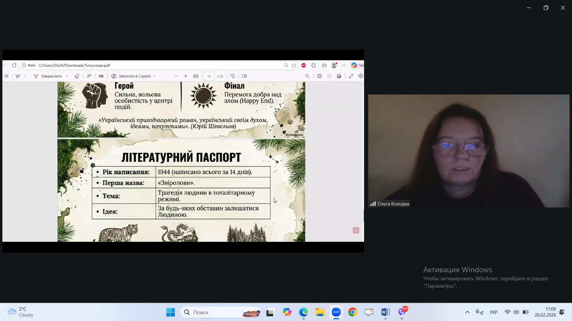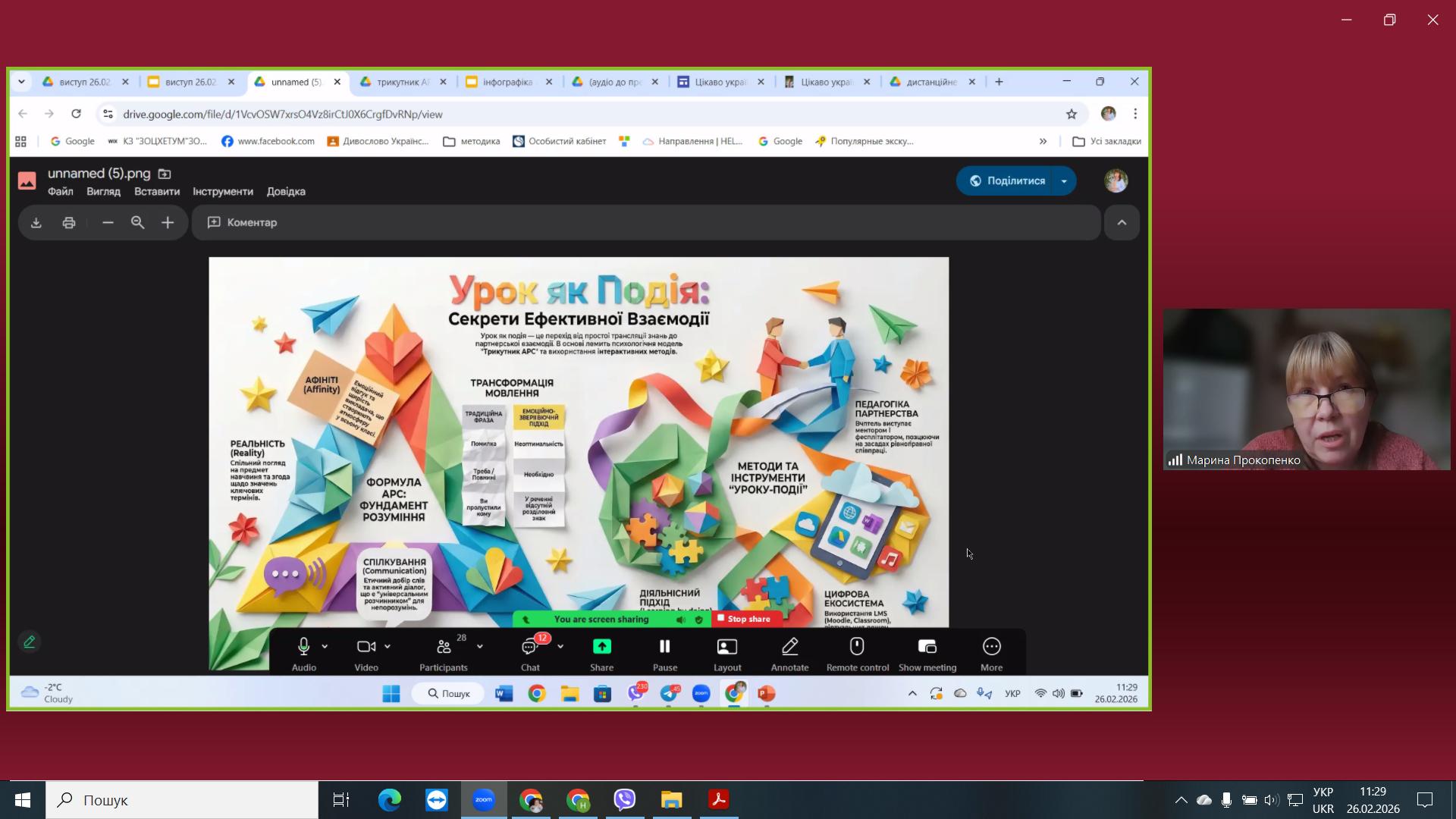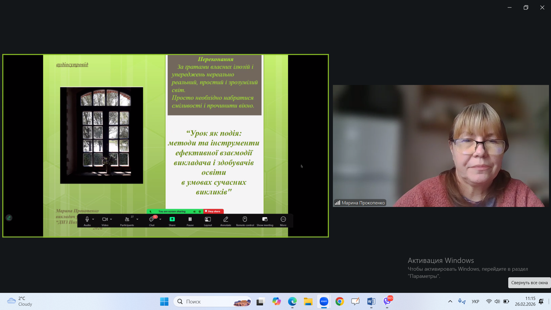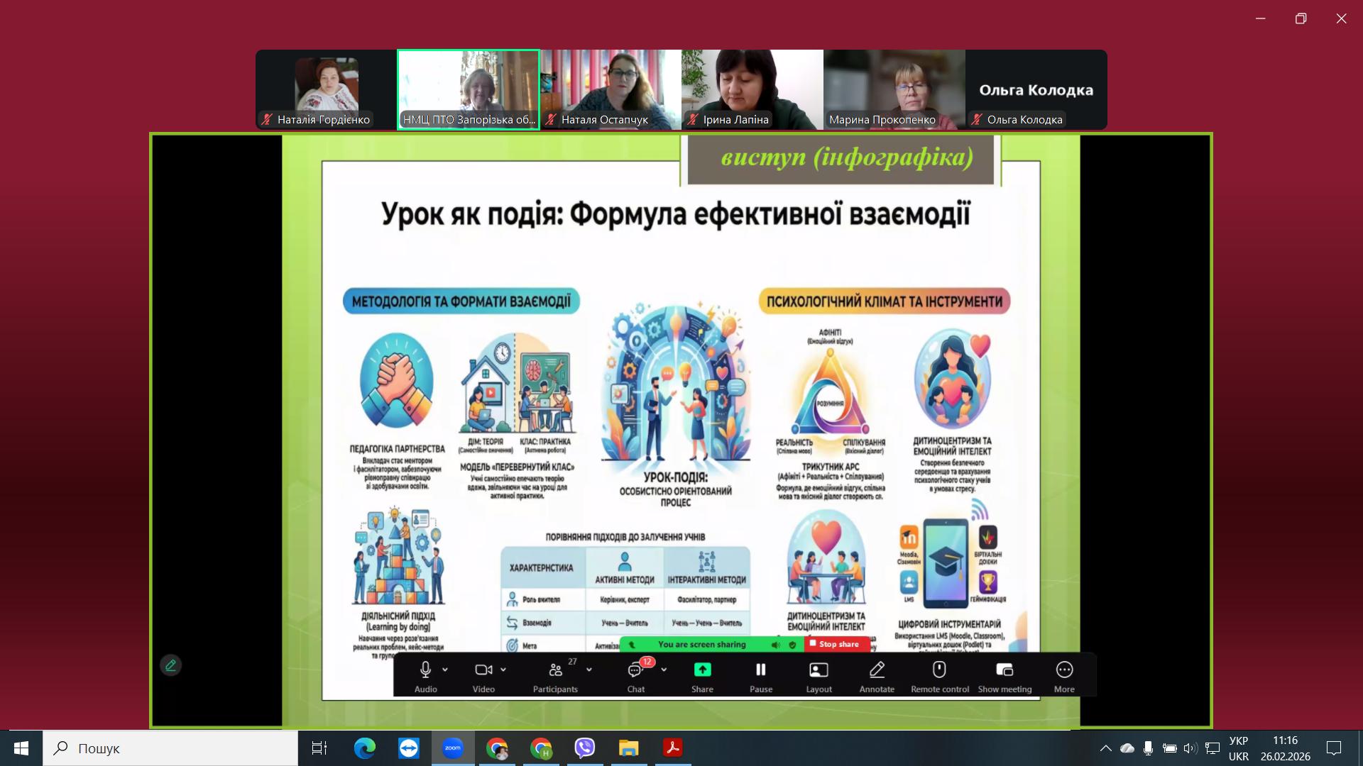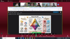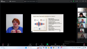 Власним досвідом на тему «Урок як подія: методи та інструменти ефективної взаємодії викладача і студентів на уроках літератури в умовах сучасних викликів» поділилася Марина Прокопенко, викладач української мови та літератури ДНЗ «Пологівський професійний ліцей». Викладачка зазначила, що урок— це особистісно орієнтований процес, де взаємодія педагога та здобувачів будується на партнерстві, креативності та емоційному залученні, що є важливим в умовах дистанційного навчання та стресу.