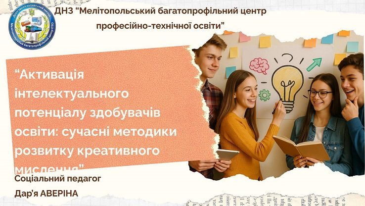 Соціальний педагог ДНЗ “Мелітопольський багатопрофільний центр професійно-технічної освіти” Дар’я АВЕРІНА провела з учасниками тренінг щодо сучасних методик розвитку креативного мислення. Учасники семінару із цікавістю та захопленням виконували вправи на креативність, інноваційне мислення та здатність до концентрації уваги.