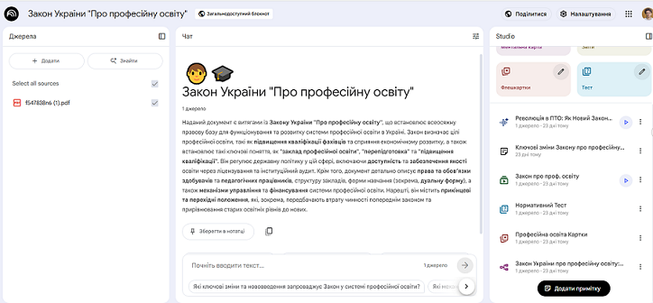 Далі методист центру, Наталя ОСІНА провела майстерклас щодо використання додатку Google NotebookLM. За допомогою нейромережі разом опрацювали Закон України “Про професійну освіту”.