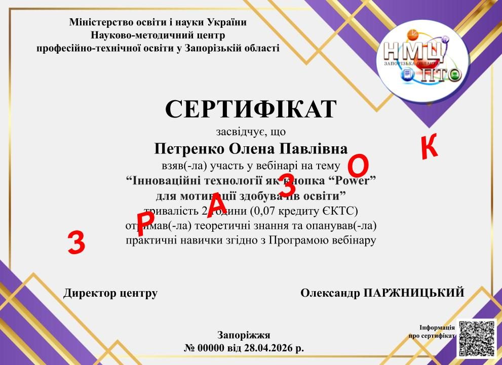 28 квітня 2026 року Науково-методичним центром професійно-технічної освіти у Запорізькій області був проведений вебінар “Інноваційні технології як кнопка “Power” для мотивації здобувачів освіти”.
